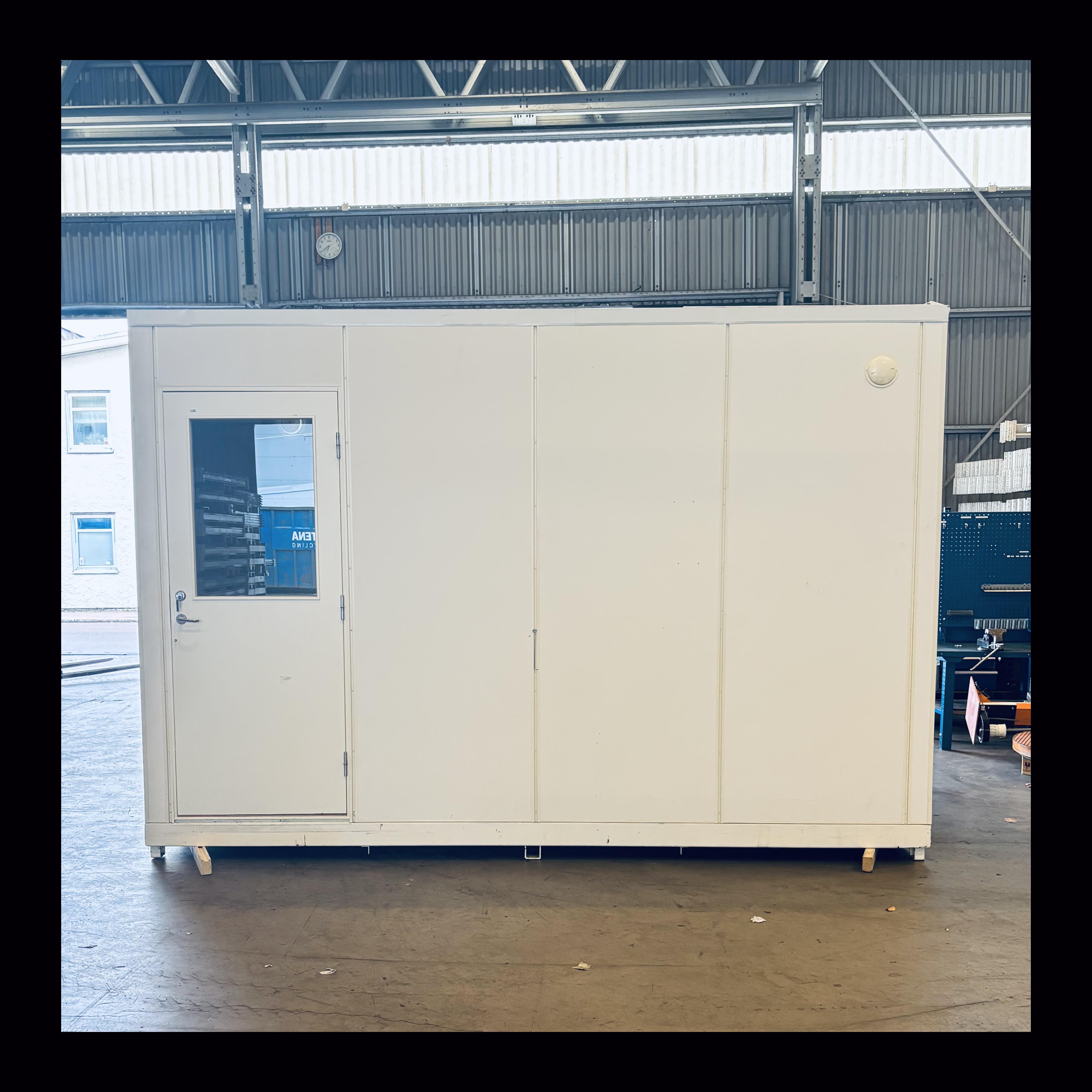Flyttbart kontor Mått: 3850x2450x2670 Färg: Vit 2 fönster på kortsidan samt i dörren.