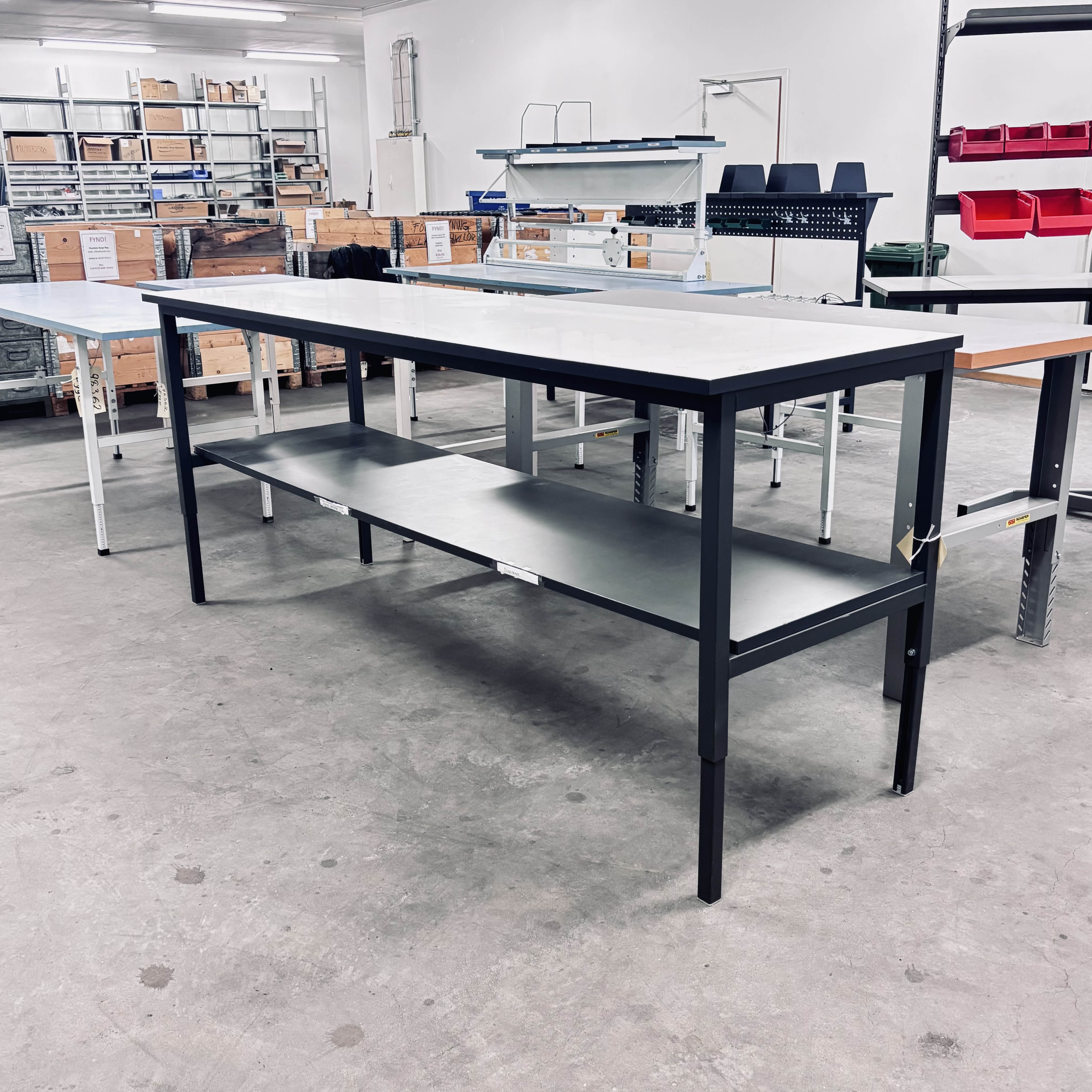 Packbord Vit skiva AJ beg Mått: 2400×800 Grått underrede Justerbara ben.