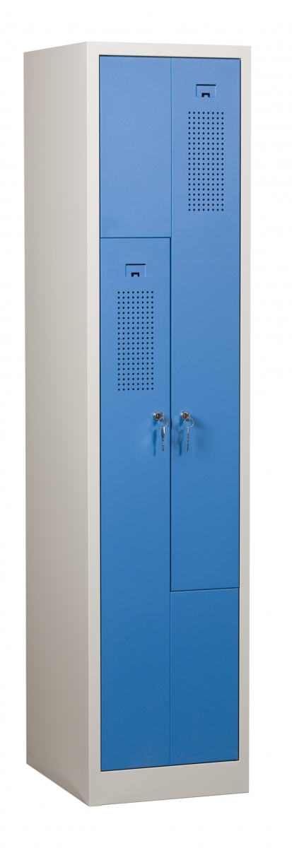 Z-skåp med två dörrar. Cylinderlås. Vikt:30 Kg Stomme: Grå. RAL 7035 Finns i färgerna blå och ljusgrå. Dörrar: Blå RAL 5012, Ljusgrå RAL 7035 Mått: 1800x415x500 mm