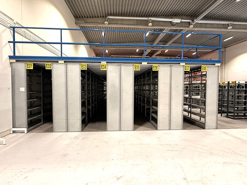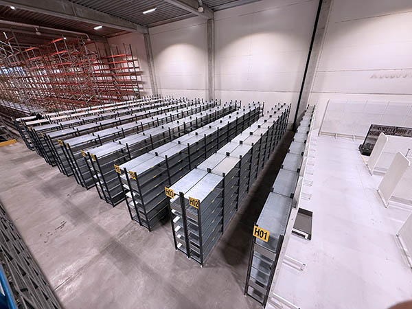Pallställen blev begagnade (en del nya gavlar) 1500 pallplatser, fabrikat EAB. Hyllställen blev med nytt material. 1000 hyllmeter, fabrikat HI-280.
